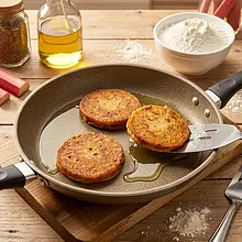 Placki ziemniaczane to klasyka kuchni polskiej znana od XIX wieku; w śląskim domu często podawano je zarówno solo, jak i z różnymi dodatkami. Dodatek rabarbaru to wiosenny twist, popularny w regionach, gdzie wykorzystywano sezonowe owoce i warzywa do urozmaicenia prostych dań.