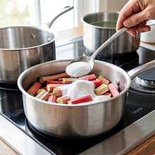 Dodaj do rabarbaru 20 g cukru (rozprowadź równomiernie), włącz mały ogień i podgrzewaj przez 6–8 minut, od czasu do czasu mieszając drewnianą łyżką. Rabarbar powinien puścić sok i częściowo się rozpaść; konsystencja powinna być miękka, ale nie całkowicie rozgotowana — widoczne kawałki o zachowanej strukturze.