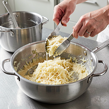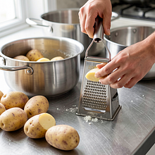 Po starciu przelej tarkowane ziemniaki małą ilością zimnej wody (200–250 ml) i energicznie wymieszaj ręką przez 20–30 sekund, aby skrobia wypłynęła do wody. Następnie przelej masę przez gęste sito lub przez ściereczkę do miski, odstawiając skrobiową wodę. Pozwól ziemniakom odciekać 1–2 minuty, a potem przełóż je do czystej ściereczki lub gazy i wyciśnij jak najwięcej wilgoci — ciśnij mocno przy krawędziach, aż woda przestanie kapać.
