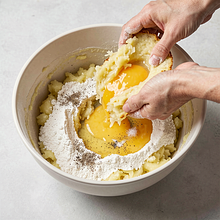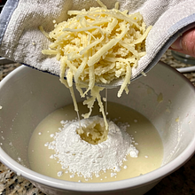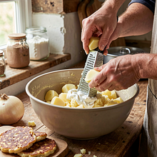 Obierz ziemniaki i cebulę. Użyj tarki o grubych oczkach (tarka do ziemniaków lub do jarzyn). Trzymaj miskę pod tarką, aby zebrać starte warzywa. Starte ziemniaki i cebulę włóż do dużej miski. Czas: ok. 6–8 minut zależnie od szybkości. Efekt: masa powinna być jednolita, nie za drobno starta — dzięki temu placki będą chrupiące.