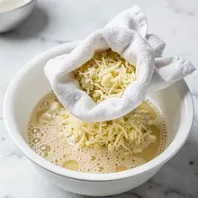 Odlej ostrożnie wodę z miski z tartymi ziemniakami, zostawiając mętną ciekłość w oddzielnym naczyniu. Pozwól masie odpocząć 1 minutę, następnie przelej masę przez gęste sito lub ścierkę, odciskając jak najwięcej wilgoci. Zebrana skrobia opadnie w naczyniu — zachowaj ją i dodaj do masy (zapewnia spójność).