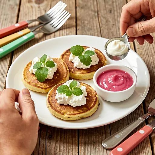 Ułóż placuszki na talerzu, na każdą porcję połóż porcję twarogu i świeżo posiekany szczaw (kilka listków posiekanych na posypkę). Podawaj z małą porcją kompotu rabarbarowego lub łyżką śmietany obok (opcjonalnie). Dla dzieci należy podawać lekko przestudzone placuszki.
