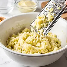 Zetrzyj obrane ziemniaki na tarce o drobnych oczkach nad dużą miską. Ścieraj je na surowo — otrzymasz wilgotną masę. Po starciu odstaw miskę na 1-2 minuty, by skrobia opadła na dno.