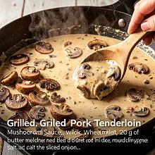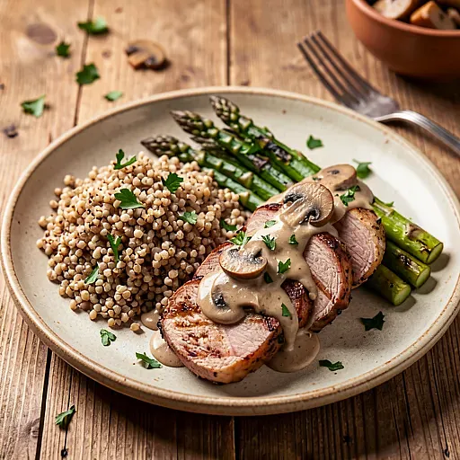 Delikatna polędwiczka wieprzowa z charakterystyczną, lekko zrumienioną skórką z grilla podana z aksamitnym sosem pieczarkowym, prażonym pęczakiem i sezonowymi zielonymi szparagami. Danie łączy klasyczną polską prostotę mięsa z grilla z bogactwem leśnych grzybów i kaszy gryczanej jako solidnego dodatku. Sos jest kremowy, z nutą musztardy i tymianku, co dodaje mu wyrazu i lekkości; pęczak daje orzechową teksturę, szparagi świeżość. Świetne na rodzinny obiad, spotkanie z przyjaciółmi lub niedzielny posiłek — estetyczne i sycące, łatwe do podania na dużej desce lub indywidualnych talerzach.