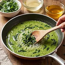 Zmniejsz ogień do małego, wlej śmietanę 18% i wymieszaj. Dodaj sok z cytryna po pół łyżce i próbuj, by zrównoważyć kwasowość szczawiu; zazwyczaj 1 łyżka wystarczy. Dopraw solą i pieprzem do smaku. Gotuj 2 minuty na bardzo małym ogniu — sos powinien być aksamitny i lekko kremowy.