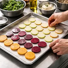Ułóż plastry na blasze wyłożonej papierem do pieczenia w jednej warstwie, tak by się nie zachodziły. Wstaw do nagrzanego piekarnika i piecz 30–35 minut, w połowie czasu zamieniając miejscami plastry (około 15–18 min) — plastry są gotowe, gdy brzegi lekko się zarumienią, a widelcowi łatwo wejdzie w środek.