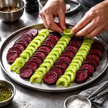 Eleganckie, sezonowe danie wegetariańskie łączące ziemisty smak pieczonego selera i buraka z kremowym musem z koziego sera, chrupiącymi chipsami z jarmużu i słodko-kwaśną glazurą pomarańczowo-miodowo-balsamiczną. Danie jest wyważone smakowo: słodycz pieczonych buraków i miodu kontrastuje z lekko pikantnym musem serowym i kwaskowatą redukcją, a tekstury przechodzą od miękkich polędwiczek warzywnych, przez kremowy mus, do kruchego jarmużu i kandyzowanych orzechów. Wygląda bardzo elegancko — plastry korzeni warzyw ułożone obok kółek musu, dekoracja z mikroliści i połyskująca glazura. Idealne jako efektowna przystawka lub lekki obiad podczas zimowych przyjęć, świetnie komponuje się z białym winem o wyraźnej kwasowości lub naparem z cytrusów dla wersji bezalkoholowej.