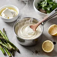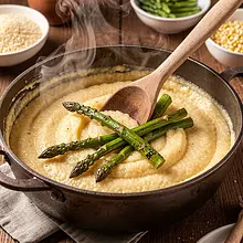 Kremowa polenta podana z pieczonymi szparagami i aksamitnym sosem chrzanowo-mascarpone to danie łączące włoską prostotę z polskim wiosennym akcentem. Polenta jest delikatna, ma maślany smak i lekko ziarnistą teksturę; pieczone szparagi dodają dymnego, zielonego kontrastu, a sos z mascarpone i wyraźnym chrzanem wnosi pikantno-kremowy twist. Potrawa świetnie sprawdzi się jako rozgrzewające danie główne podczas chłodniejszych wiosennych dni lub elegancka propozycja na kolację z przyjaciółmi. Podawać natychmiast po przygotowaniu, posypaną parmezanem i ozdobioną świeżym szczawiem lub skropioną sokiem z cytryny dla dodatkowej świeżości. Wizualnie prezentuje się efektownie: złocista polenta, zielone szparagi i biały kremowy sos z iskrzącymi się płatkami sera.