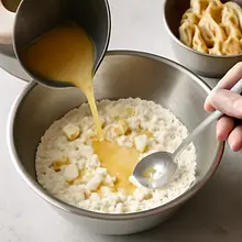 W osobnej miseczce roztrzep lekko 120 g jajek z 60 g śmietany kwaśnej, 30 g wódki, 60 ml mleka, 6 g skórki pomarańczowej i 5 g ekstraktu waniliowego. Wlej płyny do suchych składników i mieszaj drewnianą łyżką, aż składniki się połączą i utworzą nierówną, nieco lepką masę.