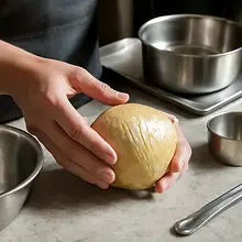 Przełóż mieszankę płynów do mąki z masłem i delikatnie zacznij zagniatać najpierw łyżką, a gdy masa będzie już mniej sypka, przełóż na lekko posypaną mąką stolnicę i wyrabiaj ręcznie przez 6–8 minut, aż ciasto będzie gładkie, elastyczne i przestanie się lepić do rąk. Jeśli ciasto jest zbyt suche, dodaj po 5 ml mleka; jeśli zbyt lepkie, podsyp odrobinę mąki (po 10 g).