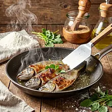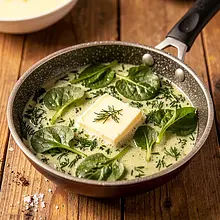 Delikatny pstrąg smażony na złoto podany z aromatycznym masłem szczawiowo-koperkowym — wiosenny wariant mazurskiej kuchni. Danie łączy świeżość szczawiu i koperku z maślanym aksamitnym sosem, dopełnione młodymi ziemniakami i szparagami. Pochodzenie inspirowane Mazurami — regionem obfitym w czyste jeziora i świeże ryby — gdzie pstrąg trafia prosto z sieci na stół. Potrawa jest lekka, ma wyraźny ziołowy akcent, przyjemną kwasowość od cytryny i szczawiu oraz maślano-słoną nutę. Doskonale pasuje do białego wina, lekkiego piwa lub chłodnej maślanki; świetnie sprawdzi się jako danie na wiosenny obiad lub niedzielne spotkanie z rodziną.