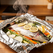 Połóż pstrąga na warzywach (skórą do dołu). Na wierzch ryby połóż kilka plasterków cytryny. Zamknij folię: złóż brzegi do siebie, a następnie sklej lub zagnij końce, tworząc szczelne 'koperty'. Pozostaw małą szczelinę u góry, żeby para mogła częściowo uciekać — zapobiegnie to rozmoczeniu warzyw.