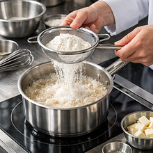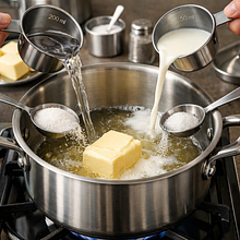 Wlej do rondla 200 ml wody, 50 ml mleka, dodaj 80 g masła, 10 g cukru i 3 g soli. Postaw na średnim ogniu i podgrzewaj, aż masło całkowicie się rozpuści, a mieszanka zacznie delikatnie wrzeć (nie doprowadzaj do gwałtownego wrzenia).