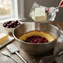 Na koniec, cienkim strumieniem wlej roztopione i ostudzone masło po ściance miski. Ponownie bardzo delikatnie wymieszaj szpatułką, tylko do połączenia. Gotową masę przelej do przygotowanej formy i wyrównaj powierzchnię. Wstaw do nagrzanego piekarnika i piecz przez około 25-30 minut. Sprawdź patyczkiem - jeśli po wbiciu w środek ciasta jest suchy, biszkopt jest gotowy. Wyjmij z piekarnika i ostudź w formie.