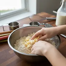 Dodaj do miski 50g zimnego masła, pokrojonego w małą kostkę (ok. 1x1 cm). Używając opuszków palców, szybko rozcieraj masło z suchymi składnikami, aż powstaną grudki przypominające mokry piasek lub grubą kaszę. Nie wyrabiaj zbyt długo, aby masło się nie roztopiło. Gotową kruszonkę wstaw do lodówki na czas przygotowywania reszty ciasta.