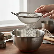 Do dużej miski przesiej 300g mąki pszennej, 2 łyżeczki proszku do pieczenia, 1 łyżeczkę sody oczyszczonej i szczyptę soli. Przesiewanie napowietrzy mąkę i pozbędzie się ewentualnych grudek, co sprawi, że ciasto będzie bardziej puszyste. Wymieszaj suche składniki trzepaczką.