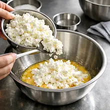 Do szerokiej miski włóż twaróg półtłusty (300 g). Jeśli twaróg jest grudkowaty, przepuść go przez sito przy pomocy łyżki lub krótko zmiksuj blenderem ręcznym (nie miksuj zbyt długo, żeby nie zrobić pasty). Dodaj żółtka z oddzielonych jaj (całe żółtka), 50 g cukru (z ogólnej ilości 100 g), śmietanę 18% (80 g), miękkie masło (30 g) oraz mleko (50 ml). Wlej sok z cytryny (15 g) i ekstrakt waniliowy (5 g). Wmieszaj mąkę pszenną (30 g), skrobię ziemniaczaną (20 g) i sól (1 g). Mieszaj drewnianą łyżką lub mikserem na najniższych obrotach do połączenia składników — masa powinna być gładka, pozbawiona większych grudek i umiarkowanie lejąca (nie całkiem płynna).
