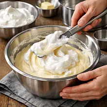 Wyjmij 1/3 ubitej piany i delikatnie wmieszaj ją do masy serowej energicznymi ruchami, aby rozluźnić krem (użyj silikonowej szpatułki, ruch cięcia i otaczania). Następnie dodaj resztę piany w dwóch partiach — każdą delikatnie składaj z dołu do góry, obracając miskę, aż masa będzie jednolita i napowietrzona. Zachowaj jak najwięcej pęcherzyków powietrza — to one dadzą puszystość.