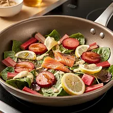 Lekka wiosenna sałatka łącząca kwaskowy, lekko karmelizowany rabarbar z delikatnie słonym wędzonym łososiem na bazie mieszanki sałat i szczawiu. Sos miodowo-musztardowy łączy słodycz z ostrą nutą musztardy i świeżością cytryny, a podsmażone szparagi oraz cienkie plasterki czerwonej cebuli dodają struktury i chrupkości. Danie ma nowoczesny charakter fusion — inspirowane polskimi smakami (rabarbar, szczaw, młode szparagi) zestawione z klasycznym wędzonym łososiem. Podawać jako przystawkę lub lekki obiad, najlepiej na dużym płaskim talerzu, udekorowane świeżym koprem. Estetycznie: kontrast czerwieni rabarbaru, różu łososia i zieleni sałat tworzy efektowne, wiosenne danie.