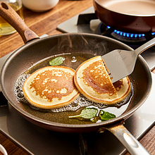 Rozgrzej patelnię o średnicy 24-26 cm na średnim ogniu i wlej olej rzepakowy. Gdy olej jest gorący (po 1-2 minutach powinien się lekko migotać, ale nie dymić), nakładaj porcje ciasta łyżką stołową lub małą chochelką, zostawiając odstęp między plackami. Smaż racuchy 2-3 minuty z jednej strony, aż na brzegach pojawią się bąbelki a spód będzie złocisty; obróć na drugą stronę i smaż kolejne 1,5-2 minuty, aż środek będzie ścięty i rumiany.