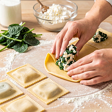 Przygotuj stożek z mąki na dużym blacie: przesiej mąkę na czysty blat, uformuj kopczyk, zrób w środku głębokie wgłębienie (jak krater). Wbij do wgłębienia 240 g jajek (4 sztuki — pozostaw jedno na później do farszu). Rozpocznij mieszanie widelcem od środka, powoli ściągając mąkę z boków do środka, aż powstanie gęsta papka. Gdy masa stanie się zbyt zbita, użyj rąk i zagarniaj mąkę tak, aby całe jajko zostało wchłonięte. Zagnieć ciasto energicznie przez 8-10 minut, aż będzie gładkie, elastyczne i przestanie kleić się do rąk. Jeśli jest lepkie, dodaj po 10 g mąki; jeśli zbyt suche, zwilż dłonie odrobiną wody.