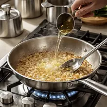 Przygotuj na kuchence garnek z podgrzewanym bulionem (1200 ml) — powinien być gorący, ale nie gotować się wrząco. W szerokim rondlu (najlepiej z grubym dnem), rozgrzej 20 g oliwy z oliwek i 20 g masła na średnim ogniu. Dodaj drobno posiekaną cebulę (150 g) i smaż 3–4 minuty, mieszając, aż cebula stanie się szklista i miękka, ale nie zrumieniona. Dodaj drobno posiekany czosnek (10 g) i smaż kolejne 30–40 sekund, aż puści aromat.
