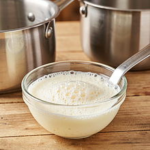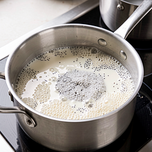 Przygotuj rozczyn: w małym rondelku lub w mikrofali podgrzej 150 ml mleka do temperatury 35–37°C (powinno być przyjemnie ciepłe, nie gorące — sprawdź nadgarstkiem). Do ciepłego mleka wsyp 1 łyżeczkę cukru z puli i rozkrusz drożdże świeże (30 g) bezpośrednio do mleka. Delikatnie wymieszaj widelcem, aż drożdże się rozpuszczą. Odstaw na 8–10 minut w ciepłe miejsce; na powierzchni powinna pojawić się pianka/pienista „czapka”, co oznacza, że drożdże są aktywne.