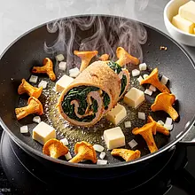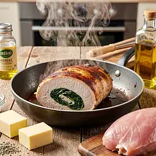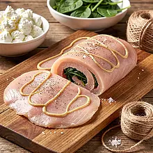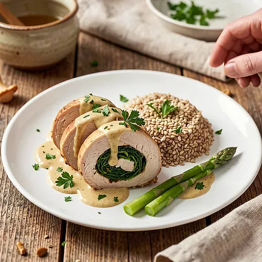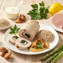 Mazurska rolada z indyka nadziewana mieszanką świeżego szpinaku i szczawiu, podana z kremowym sosem z kurek. Danie łączy wiosenną świeżość kwaskowatego szczawiu i zielonego szpinaku z delikatnym mięsem indyka oraz aromatycznym, lekko maślanym sosem grzybowym. Inspirowane smakami Mazur — pachnące lasem kurki, natka pietruszki i odrobina cytryny podbijają smak farszu. Podawać z kaszą pęczak i młodymi szparagami lub duszonymi młodymi warzywami. Estetycznie prezentuje się pokrojone w plastry, z sosem polanym z boku i świeżą natką jako dekoracją.
