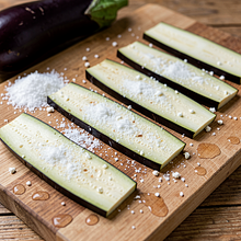 Ułóż plastry bakłażana na desce lub w dużym durszlaku i posyp równomiernie 2 g soli (użyj części soli z listy). Odstaw na 20 minut, aby wyciągnąć nadmiar wody i nieco goryczki. Po 20 minutach opłucz plastry pod bieżącą wodą, aby usunąć nadmiar soli, a następnie osusz każdy plaster papierowym ręcznikiem przyciskając do powierzchni, by odsączyć wilgoć.