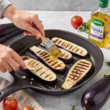 Rozgrzej patelnię grillową na średnio-wysokim ogniu (lub piekarnik do 220°C, funkcja grill). Posmaruj każdy plaster odrobina oleju rzepakowego z obu stron pędzelkiem lub silikonowym pędzlem. Układaj plastry partiami na gorącej patelni i smaż 2–3 minuty z każdej strony, aż pojawią się ciemne paski i środek stanie się miękki (powinien uginać się pod lekkim naciskiem). Jeśli używasz piekarnika, układaj plastry na blaszce z papierem do pieczenia i piecz 8–10 minut na stronę.