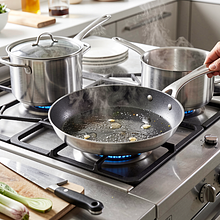 Najlepsza jest patelnia grillowa z żebrowaną powierzchnią; jeśli nie masz, zwykła nieprzywierająca również się nada. Nie przesuwaj plastrów zbyt wcześnie — odczekaj, aż się zrumienią (zwykle 90–120 s).