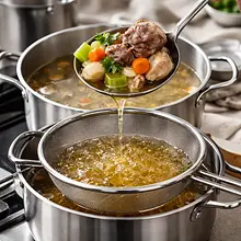 Wyjmij mięso i większe kawałki warzyw z garnka za pomocą łyżki cedzakowej. Przelej wywar przez drobne sitko wyłożone gazą lub bardzo drobnym sitkiem do innego garnka lub miski, aby uzyskać klarowny płyn. Odciśnij delikatnie warzywa i kości, ale nie zbyt mocno — chcemy tylko płyn.