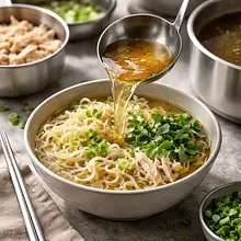 Kiedy mięso jest miękkie i wywar ma głęboki smak (po 1,5–2 godzinach), dodaj sól — zaczynaj od połowy przewidzianej ilości (np. połowa z 8 g = 4 g), zamieszaj i spróbuj po kilku minutach. Jeśli chcesz bardziej klarowny rosół, zdejmij garnek z ognia i odczekaj 10 minut — tłuszcz lekko wypłynie na powierzchnię, wtedy zbierz łyżką nadmiar tłuszczu.