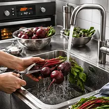 Rozgrzej piekarnik do 200°C (z termoobiegiem 180°C). Oczyść buraki: opłucz pod bieżącą wodą, obetnij liście i korzenie, ale pozostaw skórkę — uchroni miąższ przed nadmiernym wysuszeniem podczas pieczenia. Każdy burak owij folią aluminiową osobno lub umieść w naczyniu żaroodpornym przykrytym folią.