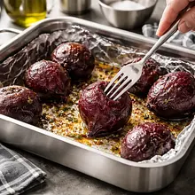 Sprawdź miękkość widelcem — gdy burak jest miękki w środku, jest gotowy. Jeśli podczas pieczenia wydobywa się sok, to normalne. Po wyjęciu odstaw do ostygnięcia na 10-15 minut, aż będzie można je dotknąć.