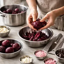 Mascarpone, Cukier puder, Ekstrakt waniliowy, Sól, Biała czekolada, Śmietanka 30%, Buraki (surowe), Sok z cytryny, Syrop różany