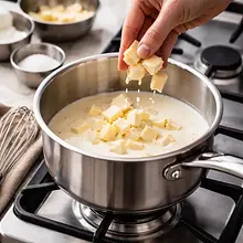 Użyj małego rondelka o grubym dnie; temperatura nie powinna być aż do wrzenia — podgrzewaj delikatnie. Agar-agar musi być całkowicie rozpuszczony, inaczej krem nie zwiąże się prawidłowo.