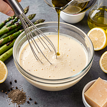 Kontynuując ubijanie, cienkim strumieniem wlewaj 80 ml oliwy z oliwek, cały czas mieszając, aż powstanie gładka emulsja. Dodaj sok z cytryny (50 g) partiami i dopraw 1–2 szczyptami soli i 2 szczyptami świeżo mielonego pieprzu. Na końcu wmieszaj starty ser parmezan (50 g). Spróbuj i skoryguj kwasowość lub sól.