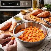 Użyj blachy z piekarnika o wymiarach przynajmniej 30×20 cm. Jeśli pokładasz bataty zbyt ciasno, będą się dusić zamiast rumienić.
