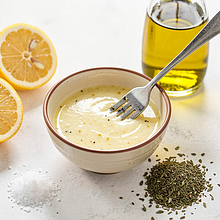 W małej miseczce połącz oliwę z oliwek (45 g), sok z cytryny (30 ml), suszone oregano (2 g), sól (2 g) i pieprz czarny (2 g). Energicznie wymieszaj trzepaczką lub widelcem przez 20–30 sekund, aż składniki się połączą w jednolitą emulsję. Spróbuj i w razie potrzeby dopraw dodatkową szczyptą soli lub kroplą soku z cytryny.
