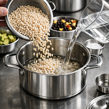 Odważ 200 g pęczaku. Wsyp pęczak do durszlaka i opłucz pod zimną, bieżącą wodą przez około 30 sekund, potrząsając durszlakiem, aż woda stanie się klarowna. To usunie nadmiar pyłu i zapobiegnie sklejaniu się kaszy.