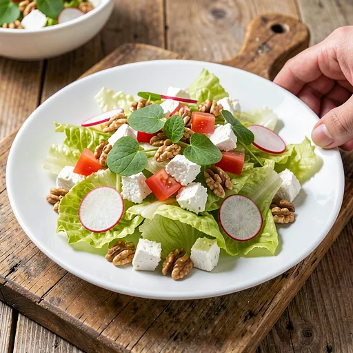 Przełóż sałatkę na półmisek lub porcjuj na talerze. Opcjonalnie posyp posiekanym orzechem włoskim (40 g) dla chrupkości. Podawaj natychmiast, aby liście pozostały chrupiące.