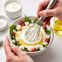 Przygotuj dressing: w małej miseczce połącz śmietanę (60 g) z sokiem z cytryny (30 ml), dodaj olej rzepakowy (30 g). Ubij składniki widelcem lub trzepaczką przez około 20-30 sekund, aż powstanie gładki, lekko emulsyjny sos. Dopraw solą (ok. 3 g) i pieprzem (ok. 1 g), spróbuj i ewentualnie dostosuj kwasowość sokiem z cytryny.