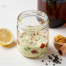Przygotuj dressing: w słoiku lub małej misce połącz olej rzepakowy (30 g), ocet balsamiczny (30 ml), sok z cytryny (30 ml), musztardę (15 g), miód (15 g) — jeśli używasz — oraz wyciśnięty czosnek (10 g). Dodaj sól (2 g) i pieprz (1 g). Zakręć słoik i energicznie wstrząśnij przez 30 sekund lub ubij trzepaczką do uzyskania emulsji (lekko kremowa konsystencja).