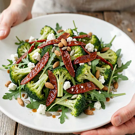 Świeża, wiosenna sałatka łącząca chrupiące brokuły z intensywnym smakiem suszonych pomidorów, kremową fetą i orzechową teksturą. To lekkie, kolorowe danie idealne na majówkowy piknik lub jako dodatek do grilla. Sałatka ma kontrast smaków: lekko gorzkawa rukola, kwaskowaty ocet balsamiczny z odrobiną miodu i aromatyczny czosnek. Podana na stole wygląda efektownie dzięki zieleni brokuła i czerwonym akcentom suszonych pomidorów. Można ją serwować jako samodzielne danie lub jako przystawkę do dań z grilla; dobrze znosi krótkie przechowywanie i transport na wycieczki.
