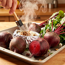 Umyj buraki pod bieżącą wodą szczotką do warzyw, odetnij liście blisko łodygi (można zachować do innego użycia). Osusz buraki papierowym ręcznikiem. Rozgrzej piekarnik do 200°C. Każdy burak zawiń osobno w folię aluminiową lub ułóż w naczyniu żaroodpornym z przykryciem. Piecz przez 45-60 minut (w zależności od wielkości) do miękkości — sprawdź, nakłuwając buraka nożem: nóż powinien wejść gładko bez oporu.