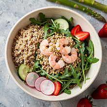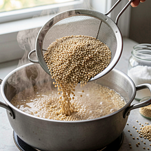 Przygotuj kaszę jaglaną: wsyp 160 g kaszy do sitka i dokładnie przepłucz zimną wodą przez 1-2 minuty, potrząsając sitkiem, aż woda będzie klarowna — to usunie goryczkę. Przełóż kaszę do małego garnka, zalej 320 ml wrzącej wody (stosunek 1:2) i dodaj szczyptę soli (1 g). Doprowadź do wrzenia na średnim ogniu, zmniejsz ogień do małego i gotuj pod przykryciem 12-15 minut aż woda wchłonie się, a kasza zmięknie. Po ugotowaniu zdejmij z ognia i odstaw pod przykryciem na 8 minut, następnie rozluźnij widelcem, aby była sypka.