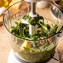 Przygotuj pesto rukolowe: do blendera lub malaksera włóż 60 g rukoli (odłóż resztę do sałatki), 60 g orzechów włoskich, 1 ząbek czosnku (ok. 5 g pozostawiony w całości) oraz starty ser żółty (ok. 50 g). Wlej 35 g oleju rzepakowego i dodaj sok z połowy cytryny (ok. 30 g). Zmiksuj pulsacyjnie, aż składniki zaczną się łączyć, następnie miksuj ciągle przez 20–30 sekund aż powstanie gęsty, ale kremowy sos. Jeśli pesto jest zbyt gęste, dodaj resztę oleju stopniowo do uzyskania pożądanej konsystencji.