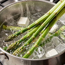 Blanszuj szparagi: wrzuć pokrojone łodygi do wrzącej, osolonej wody i gotuj 2-3 minuty (mają stać się jasnozielone i zachować jędrność). Natychmiast przełóż do miski z lodowatą wodą (woda z lodem) na 1-2 minuty, aby zatrzymać proces gotowania i zachować kolor. Odcedź i osusz ręcznikiem.