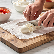 Odsącz mozzarellę z zalewy: umieść kulki na durszlaku lub papierowym ręczniku na 5 minut, a następnie delikatnie osusz. Pokrój mozzarellę na plastry o tej samej grubości co pomidory (4–6 mm). Jeśli kula jest duża, trzymaj plaster przy plasterze, by nie rozkruszyć sera.